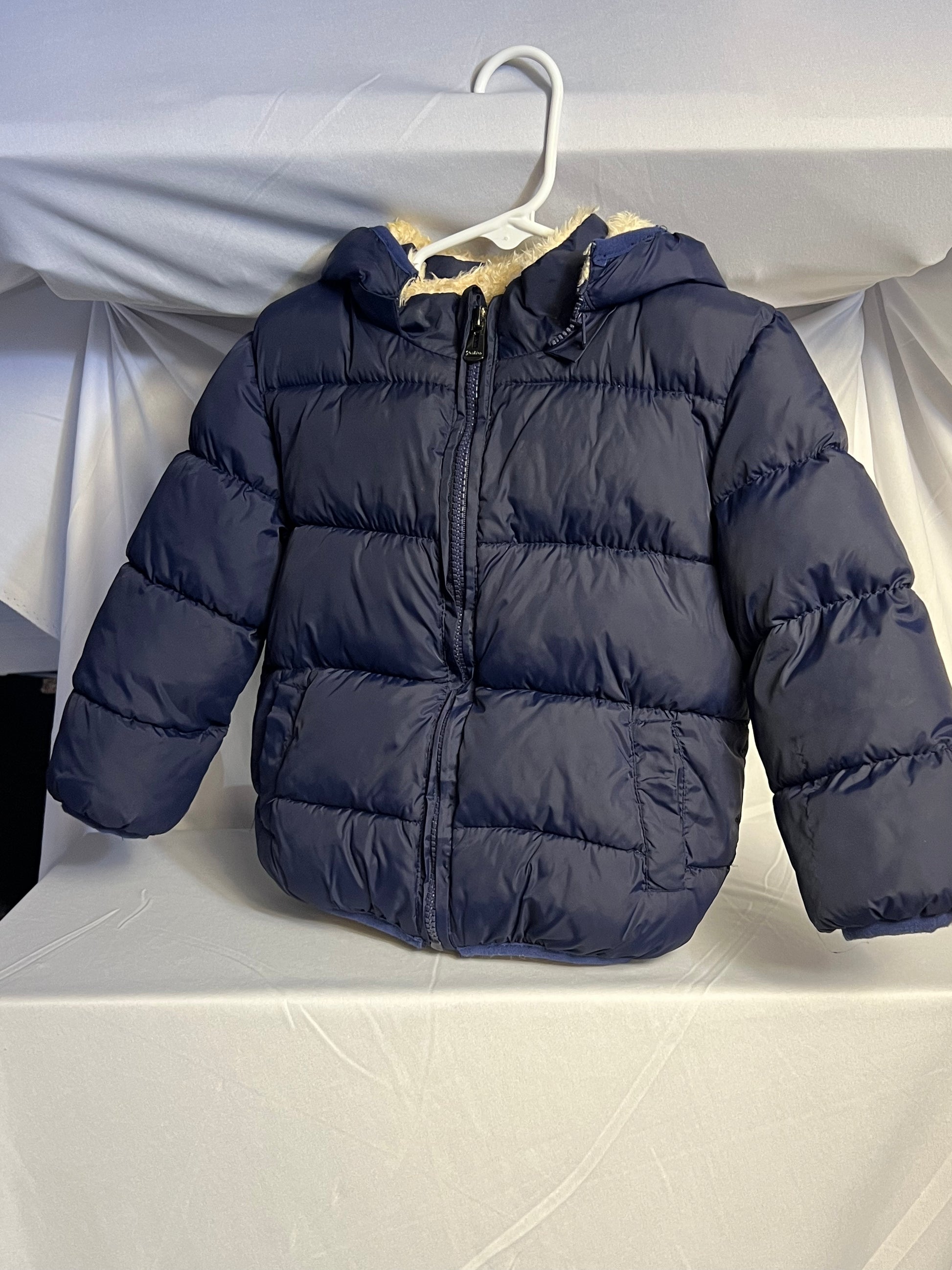 Navy winter coat, lined with fur throughout the sleeves. Very warm! Worn by Sol a few times.
